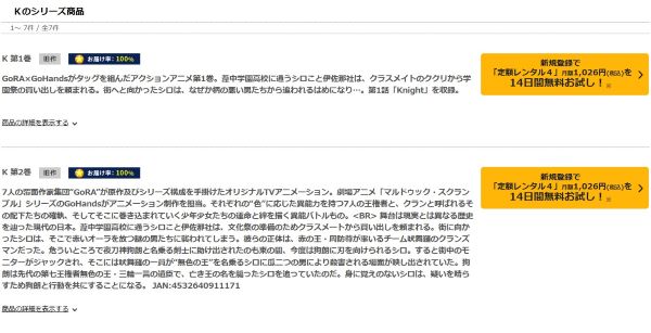 動画配信サービスとは少し違い、DVDレンタルサービスになりお試し期間で、「K ケイ(1期)」の動画を全話視聴することができます。