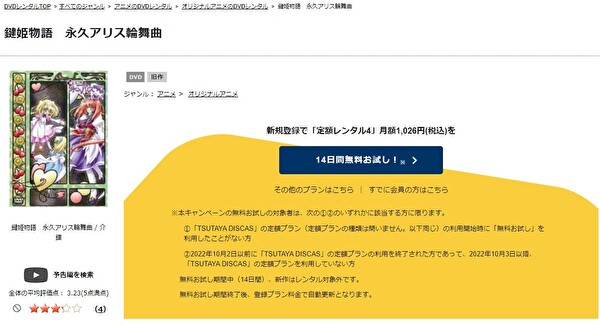 TSUTAYA DISCASは、準新作は8枚まで、話題作・旧作は枚数制限なしでお試し期間中に無料レンタルができ「鍵姫物語 永久アリス輪舞曲」のアニメは、旧作なので無料視聴可能です。