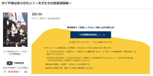 TSUTAYA DISCASは、準新作は8枚まで、話題作・旧作は枚数制限なしでお試し期間中に無料レンタルができ「かぐや様は告らせたい?〜天才たちの恋愛頭脳戦〜(2期)」のアニメは、旧作なので無料視聴可能です。