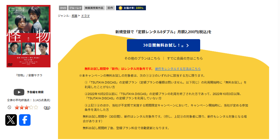TSUTAYA DISCASは、準新作・話題作・旧作が8枚までお試し期間中に無料レンタルができ映画『怪物』は、旧作なので無料視聴可能です。