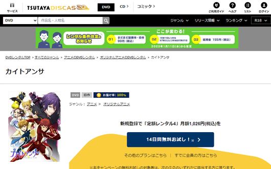 TSUTAYA DISCASは、準新作は8枚まで、話題作・旧作は枚数制限なしでお試し期間中に無料レンタルができ「カイトアンサ」のアニメは、旧作なので無料視聴可能です。