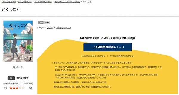 TSUTAYA DISCASは、準新作は8枚まで、話題作・旧作は枚数制限なしでお試し期間中に無料レンタルができ「かくしごと」のアニメは、旧作なので無料視聴可能です。