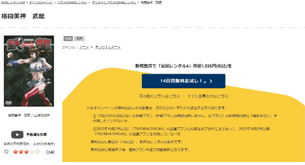 『TSUTAYA DISCAS』は初回登録で、14日間のお試し期間があるのでアニメ「格闘美神 武龍」をお試しで全話視聴することができますよ。