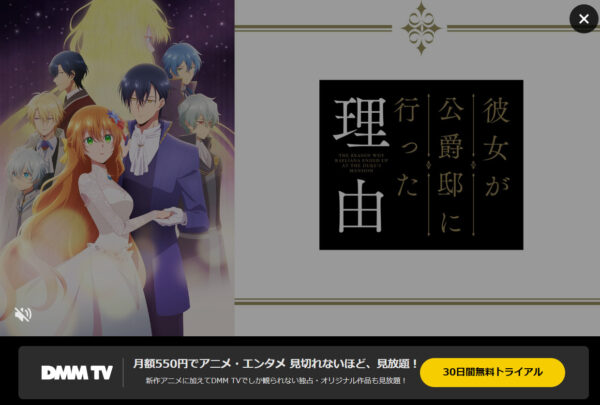 先に結論をお伝えすると、アニメ「彼女が公爵邸に行った理由」は、『DMMTV』の動画配信サイトで全話無料で配信中です。