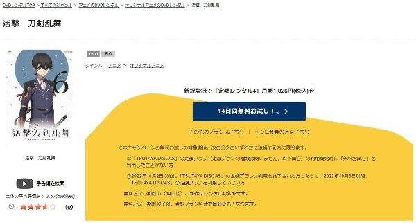 TSUTAYA DISCASは、準新作は8枚まで、話題作・旧作は枚数制限なしでお試し期間中に無料レンタルができ「活撃刀剣乱舞」のアニメは、旧作なので無料視聴可能です。