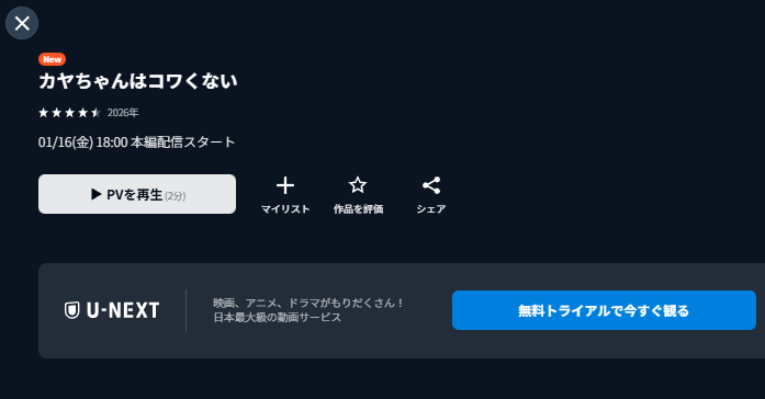 「カヤちゃんはコワくない」を誰よりも早く視聴したい方は、U-NEXTをチェックしてみてください。
