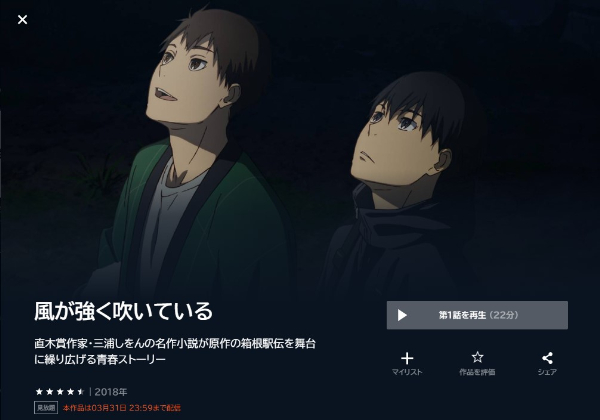 Netflixでアニメ「風が強く吹いている」の動画の配信予定