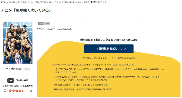 TSUTAYA DISCASは、準新作は8枚まで、話題作・旧作は枚数制限なしでお試し期間中に無料レンタルができ「風が強く吹いている」のアニメは、旧作なので無料視聴可能です。
