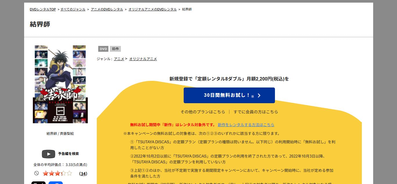 このDVDレンタルサービスを使うことで、DVDを自宅に取り寄せて、アニメ「結界師」を視聴可能です。