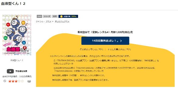 TSUTAYA DISCASは、準新作は8枚まで、話題作・旧作は枚数制限なしでお試し期間中に無料レンタルができ「血液型くん!2(2期)」のアニメは、旧作なので無料視聴可能です。