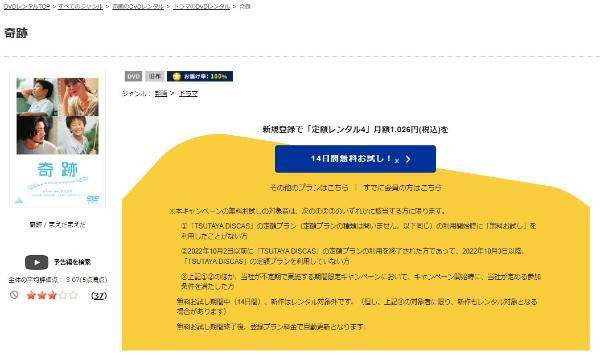 そして、映画「奇跡」はツタヤディスカスで配信しているので、無料でDVDレンタルが可能です。