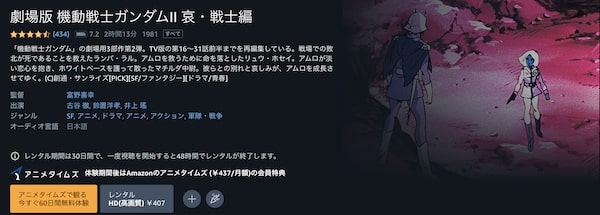 しかし、Amazonプライムビデオは無料期間が30日間ありますが、「機動戦士ガンダムII 哀・戦士編」の映画はレンタル作品で407円かかってしまうため無料視聴することができません。