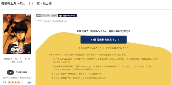 TSUTAYA DISCASの定額4プランは、準新作・話題作・旧作は4枚までお試し期間中に無料レンタルができるので、「機動戦士ガンダムII 哀・戦士編」の関連作品の映画を無料視聴した後もお試し期間中なら他の映画も無料でレンタルすることができますよ。