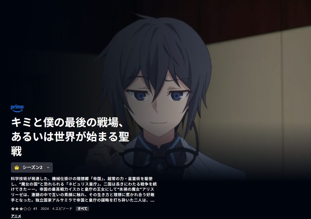 人気の動画配信サイトAmazonプライムでも、アニメ「キミと僕の最後の戦場、あるいは世界が始まる聖戦 Season II」を視聴できるか調査しました。