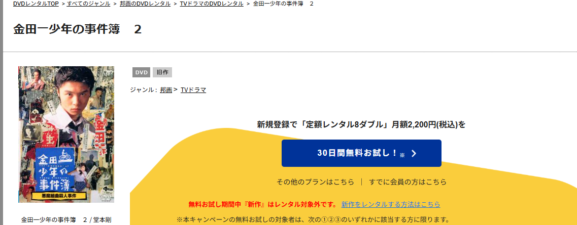 TSUTAYA DISCASのお試し期間中は、準新作・話題作・旧作が8枚まで無料レンタルができ、ドラマ「金田一少年の事件簿第2シリーズ(堂本剛)」は、旧作なので無料視聴可能です。
