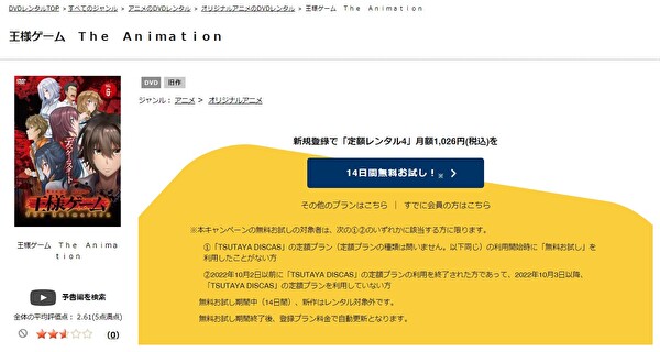 TSUTAYA DISCASは、準新作は8枚まで、話題作・旧作は枚数制限なしでお試し期間中に無料レンタルができ「王様ゲーム The Animation」のアニメは、旧作なので無料視聴可能です。