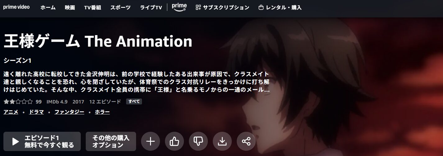 しかし、Amazonプライムはアニメ「王様ゲーム The Animation」の動画はレンタルで視聴できますが、関連動画やシリーズ作品の中には見放題で配信されているものがあります。
