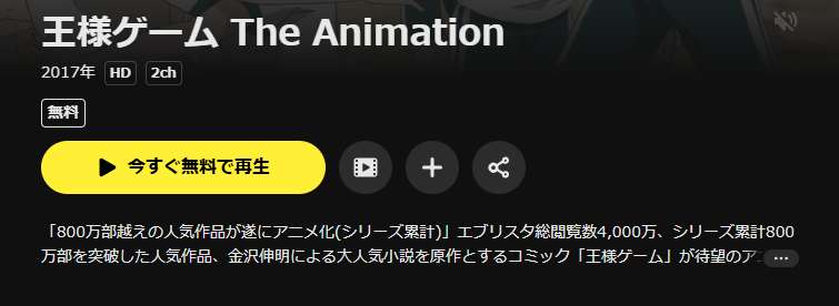 2026年2月現在、DMM TVでは「王様ゲーム The Animation」の動画が見放題で配信中です。