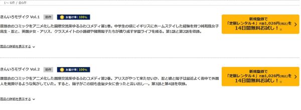TSUTAYA DISCASは、準新作は8枚まで、話題作・旧作は枚数制限なしでお試し期間中に無料レンタルができ「きんいろモザイク(1期)」のアニメは、旧作なので無料視聴可能です。