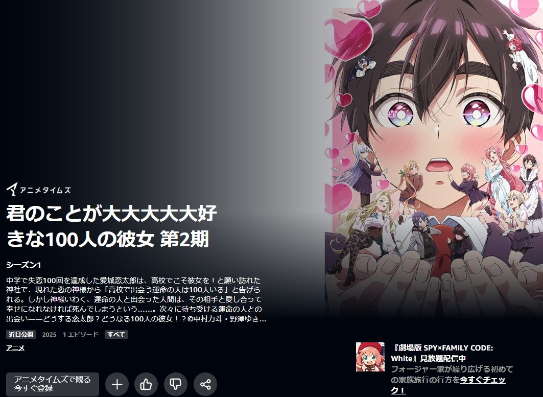 Amazonプライムでアニメ「君のことが大大大大大好きな100人の彼女 2期」の動画を全話無料視聴