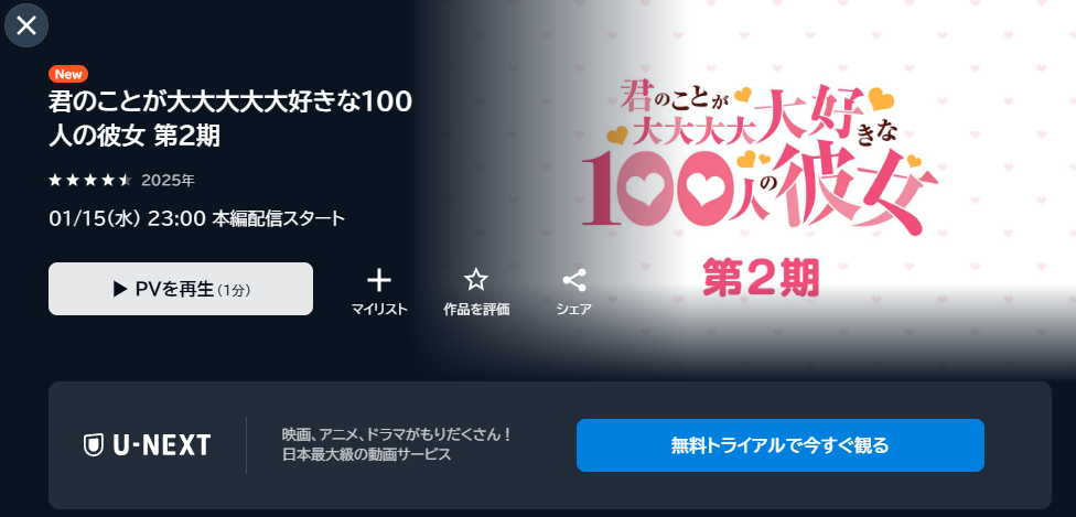 先に結論をお伝えすると、アニメ「君のことが大大大大大好きな100人の彼女 2期」は、『U-NEXT』の動画配信サイトで無料トライアル期間中に全話視聴が可能です。