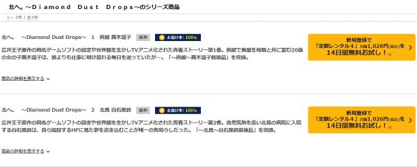 TSUTAYA DISCASは、準新作は8枚まで、話題作・旧作は枚数制限なしでお試し期間中に無料レンタルができ「北へ。~Diamond Dust Drops~」のアニメは、旧作なので無料視聴可能です。