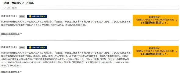 動画配信サービスとは少し違い、DVDレンタルサービスになりお試し期間で、「恋姫†無双」の動画を全話視聴することができます。