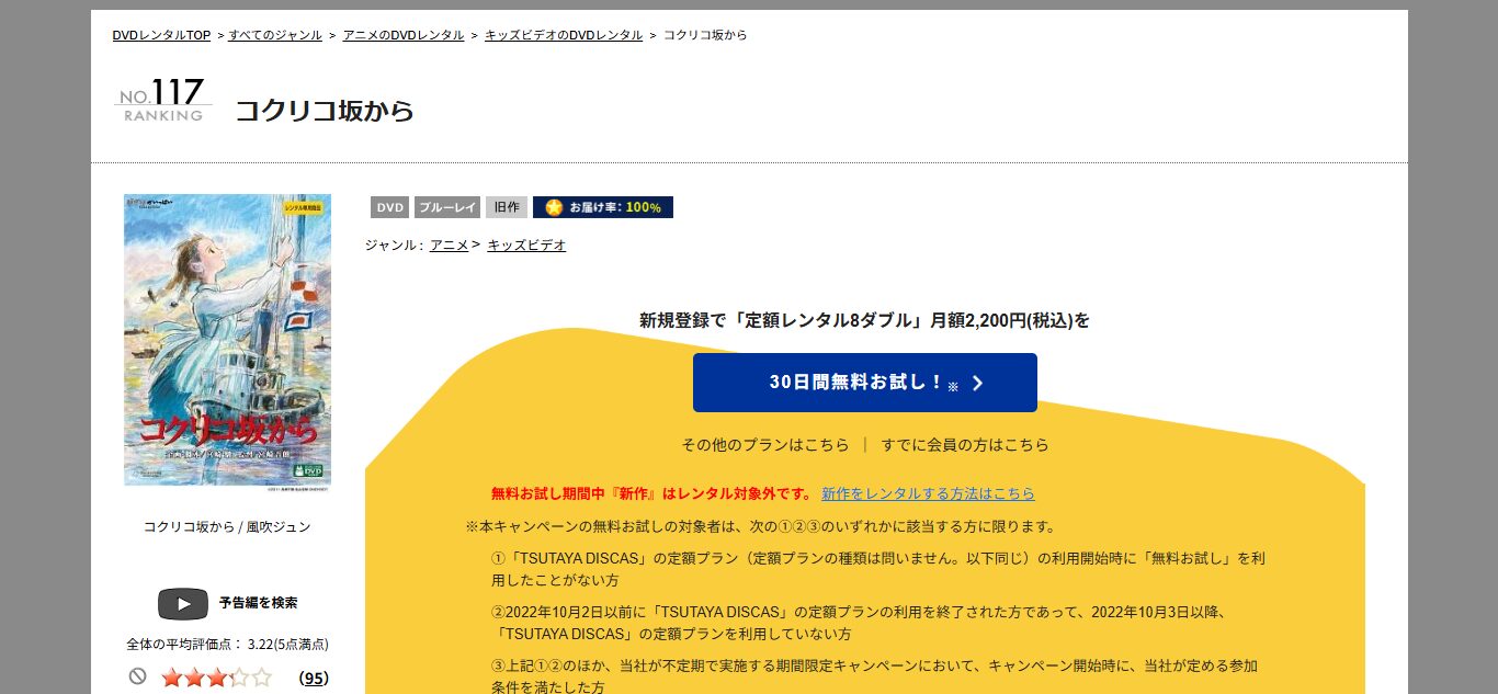 『TSUTAYA DISCAS』には、初回限定の30日間無料トライアルがあるため、トライアル期間中は、「コクリコ坂から」をはじめとするジブリ作品を、追加料金なしでDVDレンタルすることができます。
