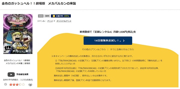 『TSUTAYA DISCAS』は初回特典で14日間の無料期間があり、お試しで利用できるので「劇場版 金色のガッシュベル!!メカバルカンの来襲」の動画をフルで無料視聴できますよ。