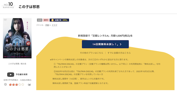 TSUTAYA DISCASの定額4プランのお試し期間中であれば、準新作〜旧作のDVDを4枚まで無料レンタルができるので、「この子は邪悪」はレンタルされていませんが、出演する南沙良さんのその他作品を無料レンタルすることができますよ。