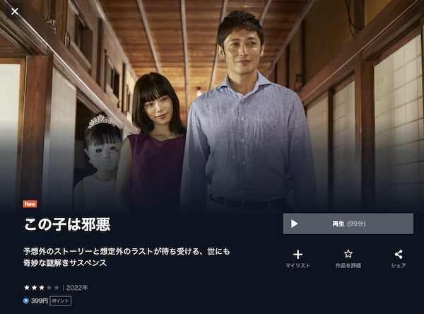 映画「この子は邪悪」をU-NEXTで視聴するのに399円のレンタル料金がかかります。