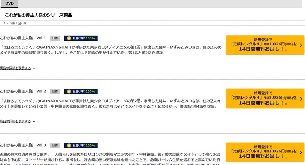 TSUTAYA DISCASは、準新作は8枚まで、話題作・旧作は枚数制限なしでお試し期間中に無料レンタルができ「これが私の御主人様」のアニメは、旧作なので無料視聴可能です。