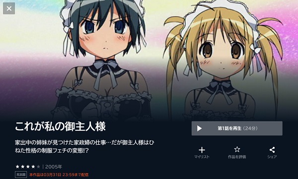 ただ、アニメ「これが私の御主人様」の関連作品やシリーズ作品は配信しているので、有料となってしまいますが見放題で視聴は可能です。