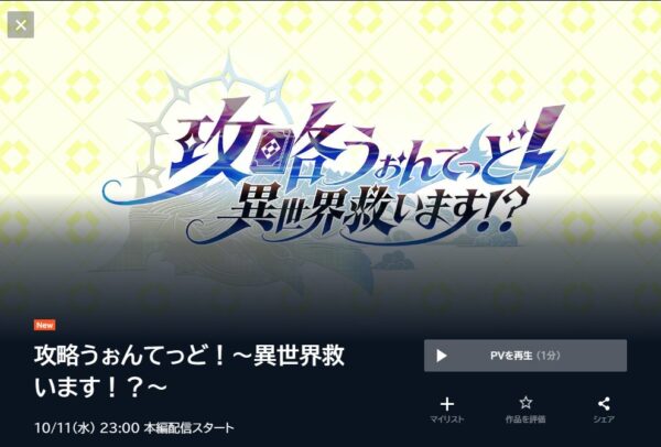 初回お試し期間が30日間あり、2024年11月現在、アニメ「攻略うぉんてっど!~異世界救います!?~」の1話~最終話(12話)が配信中となっておりフルで視聴できます。