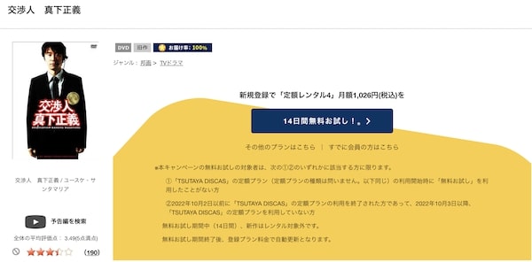 ツタヤディスカスは、準新作・話題作・旧作が4枚までなら、無料お試し期間中にレンタルができるので、「交渉人 真下正義」の映画を無料で視聴した後も14日間以内なら他のシリーズ作品や見たかった映画も無料でレンタルすることができますよ。