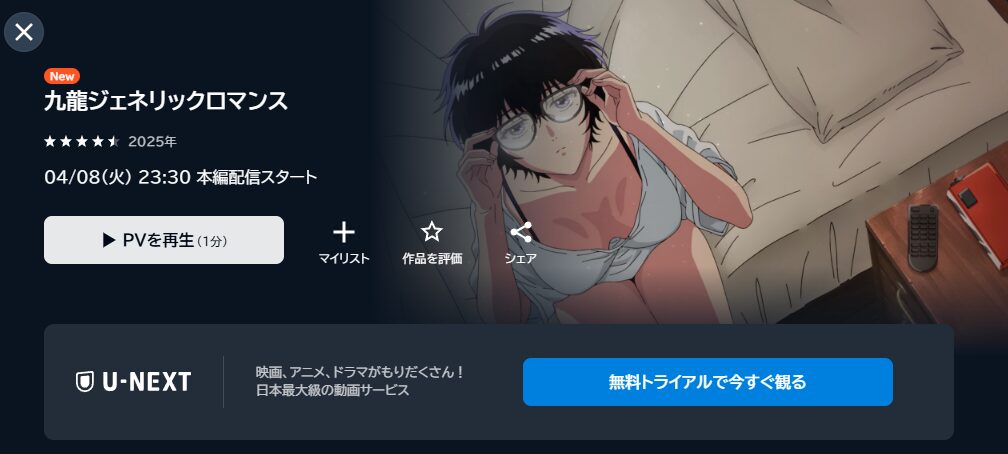 先に結論をお伝えすると、アニメ「九龍ジェネリックロマンス」は、『U-NEXT』の動画配信サイトで無料トライアル期間中に全話視聴が可能です。