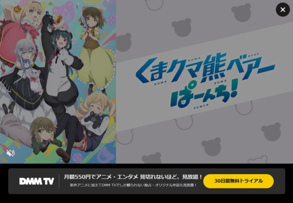 『DMMTV』は初回登録で、30日間のお試し期間があるのでアニメ「くまクマ熊ベアーぱーんち!2期」をお試しで全話視聴することができますよ。