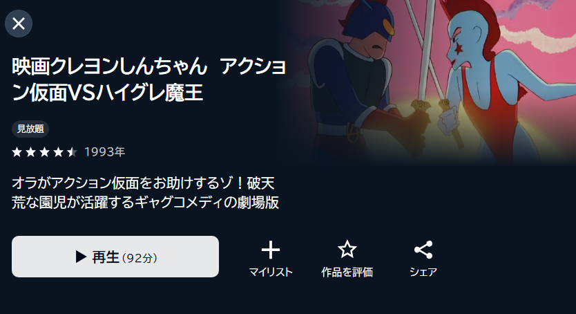 - 映画「クレヨンしんちゃん アクション仮面VSハイグレ魔王」がフル視聴可能。