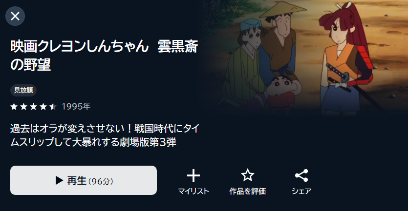 また、映画「クレヨンしんちゃん 雲黒斎の野望」の関連作品の映画も無料トライアル中にフル視聴が可能です。