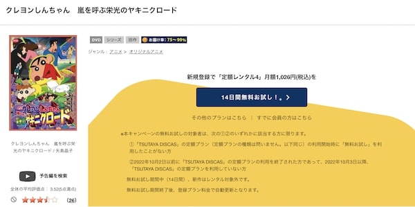 TSUTAYA DISCASの定額4プランは、準新作・話題作・旧作は4枚までお試し期間中に無料レンタルができるので、「クレヨンしんちゃん 嵐を呼ぶ 栄光のヤキニクロード」の関連作品の映画を無料視聴した後もお試し期間中なら他の映画も無料でレンタルすることができますよ。