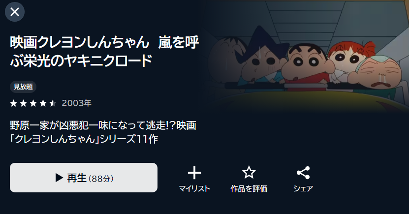 以上、映画「クレヨンしんちゃん 嵐を呼ぶ 栄光のヤキニクロード」の動画配信状況をまとめました。