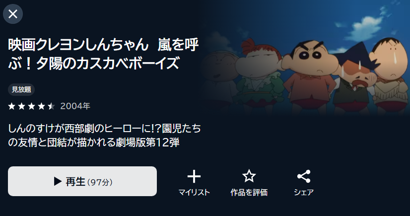 • 映画「クレヨンしんちゃん 嵐を呼ぶ!夕陽のカスカベボーイズ」がフル視聴可能。