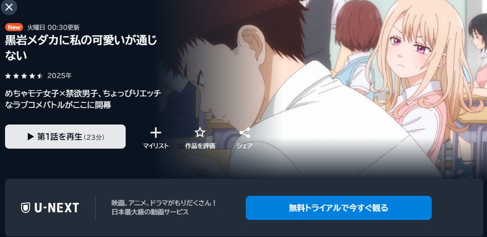 先に結論をお伝えすると、アニメ「黒岩メダカに私の可愛いが通じない」は、『U-NEXT』の動画配信サイトで無料トライアル期間中に全話視聴が可能です。