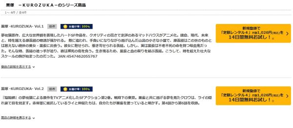 TSUTAYA DISCASは、準新作は8枚まで、話題作・旧作は枚数制限なしでお試し期間中に無料レンタルができ「黒塚 KUROZUKA」のアニメは、旧作なので無料視聴可能です。