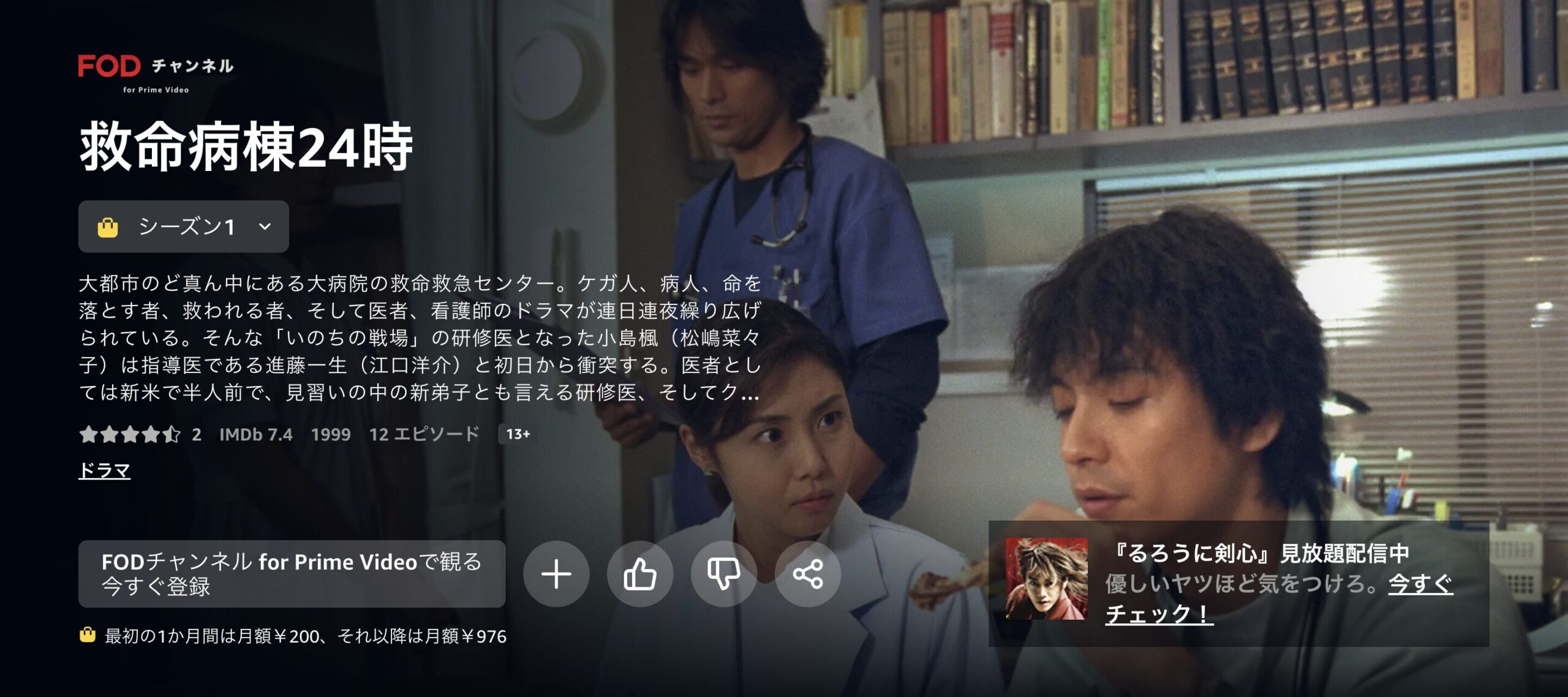 Amazon経由で、FODチャンネルに登録すれば、救命病棟24時の動画を視聴することはできます。