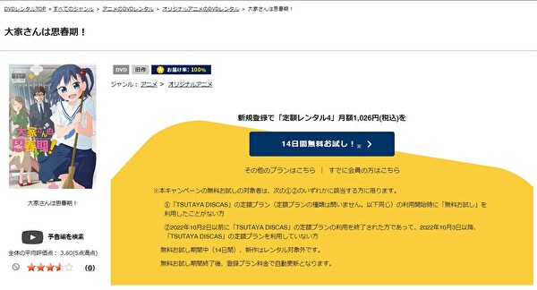 動画配信サービスとは少し違い、DVDレンタルサービスになりお試し期間で、「大家さんは思春期!」の動画を全話視聴することができます。