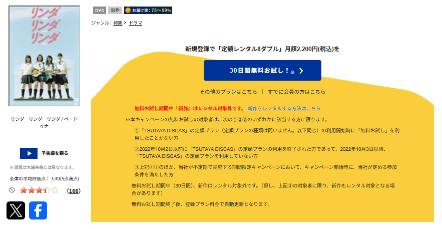 TSUTAYA DISCASは、準新作・話題作・旧作が8枚までお試し期間中に無料レンタルができ映画『リンダ リンダ リンダ』は、旧作なので無料視聴可能です。