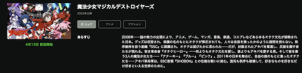 Amazonプライムでは、アニメ「魔法少女マジカルデストロイヤーズ」は見放題で2023年4月12日から配信されております。