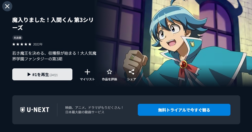 14日間の無料トライアルを利用すれば、追加料金なしでアニメ「魔入りました!入間くん(3期)」を全話視聴できます。