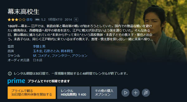 映画「幕末高校生」はAmazonプライムビデオでもフルで視聴することができます。